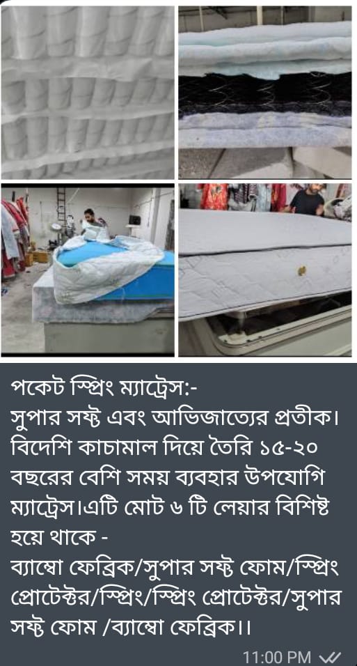 ঘুম শুধু বিশ্রাম নয় — এটি আপনার সুস্থ জীবনের অংশ। আমাদের পকেট স্প্রিং ম্যাট্রেসে রয়েছে শত শত ইন্ডিভিজুয়াল পকেট স্প্রিং, যা আপনার শরীরের ওজন অনুযায়ী আলাদা আলাদা ভাবে সাপোর্ট দেয়।